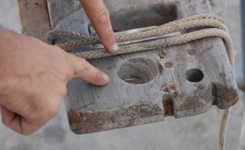 Unterwegs wird das Brett quer über das Heck festgebändselt, wo es an den beiden Enden zur Aufnahme der beiden Angeln dient (Foto). Und, wenn die Angelei Erfolg hat, dann dient das dicke Mahagoni-Holz gleichmal als Schlachtbank, damit das weniger Schöbe beim Angeln gleich achtern über die Kante fliegen kann. Das Meer läßt nichts verkommen.