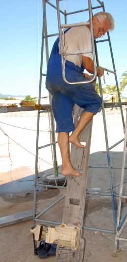 Der wirkliche Clou aber ist eine Idee von Klaus, in das Fenderbrett gleich eine Leiter zu integrieren. Wozu, um Gottes willen, braucht man auf einer Fahrtenyacht eine Leiter. Wer so fragt, hat noch nie am Steg eines Tidenhafens festgemacht. Nein, ich spreche jetzt nicht von einer modernen Marina mit Schwimmstegen, sondern von einem Hafen mit "nur" zwei oder drei Meter Tidenhub, so, wie eben die Verhältnisse in den Häfen der Südsee sind (zum Beispiel). Da ist eine Leiter gelegentlich für den Landgang unersetzlich, denn wie sollte man sonst die Pier über sich erklimmen können.