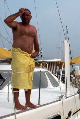 Schweizer Rolf von der YELO lobt bei seinem 43-Fuß-Katamaran Cathana vor
