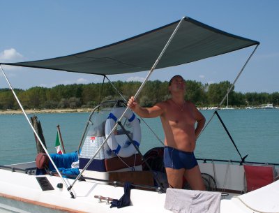 Also Sonnenschutz ist nötig. Und teuer, 1500 Euro kann es schon sein, dass man für ein Bimini hinblättern muß. Das kann auch billiger haben, sagt Erich Zahourek (man sage ja nichts gegen die Motorbootfahrer!):