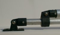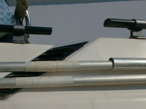 Da die Alustangen zumeist nicht den erforderlichen Durchmesser aufweisen, habe ich meine mit einer Flex angeschliffen und dann die Scharniere draufgeklopft. Das hält wie eine Presspassung. Gesichert wird mittels Schraube, auch dort wo die Stangen zusammen gesteckt sind. Das weiße Isolierband schützt gegen scheuern. Am stabilsten wird es, wenn die Abspannungen an den vier höchsten Punkten in den Ecken montiert sind, nicht wie am Fotoin halber Höhe. Bei der Fläche entwickelt sich ein beachtlicher Winddruck. Daher das Alu Überschubrohr von einem Paddel, weil dort eine Strebe unter Fahrt brach.