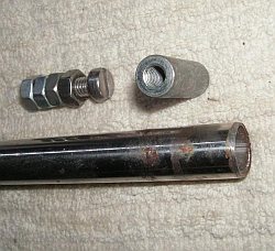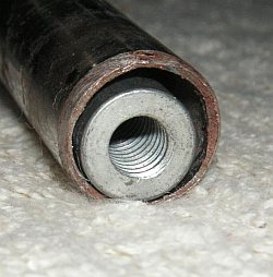 In die Rohre habe ich dann Innengewindestangen eingeklebt, und zwar mit Epoxy-Steel, fünf Minuten Härtezeit. Sind solche Teile nicht verfügbar, kann man auch auf eine Schraube mehrere Muttern aufschrauben und klebt diese dann vorsichtig in das Nirosta-Rohr ein. Nach Aushärten des Epoxy-Steels dreht man dann einfach die Schraube wieder raus und fertig ist die Sache.
