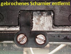 werden: Am besten, das gebrochene Scharnier mit Epoxy-Steel, 5 min. Härtezeit, einkleben und mit einer 3 mm S/S Schraube zusätzlich befestigen. Das war die Lösung!