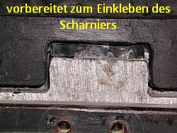 Den dann über dem Scharnier noch vorhandenen Hohlraum ebenfalls mit Epoxy-Steel ausfüllen.